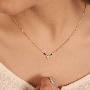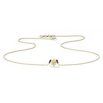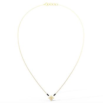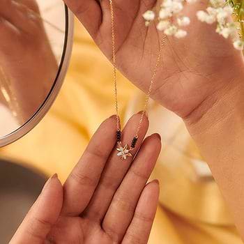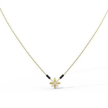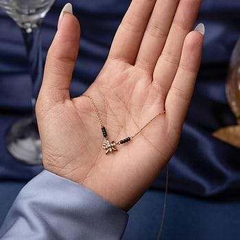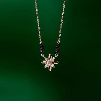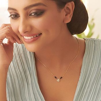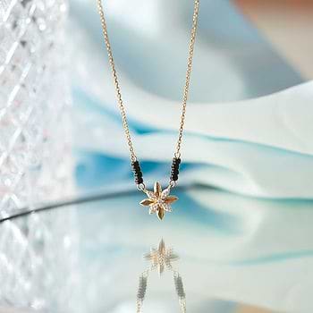 Lina Diamond Mangalsutra by CaratLane. If you want to keep that hint of tradition and yet flaunt it in contemporary style, then this mangalsutra is what you need. The jewlery comes with black bead string attached to a floral design to make your look ultra-chic and very appealing. This particular diamond mangalsutra has 2.310 g gold and SI IJdiamond weighing 0.060 ct. A small, super cute pendant that can be worn on any occasion.