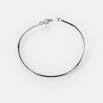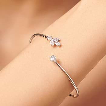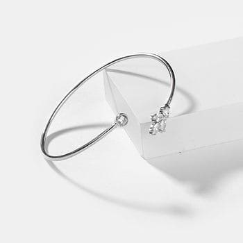 Minimalistic Silver Flexi Bracelet with a Leaf Motif, studded with AAA quality Cubic Zircons (CZ). Crafted in 925 Silver with a High Polish Finish. Uniquely handcrafted, no two pieces are exactly alike! Size: 57.8 mm (Current Size 57.2 mm fits well from 54.3 to 60.0 mm) | Motif Length: 14.0 mm | Motif Breadth: 9.0 mm | Gap between the Motifs: 13.0 mm
