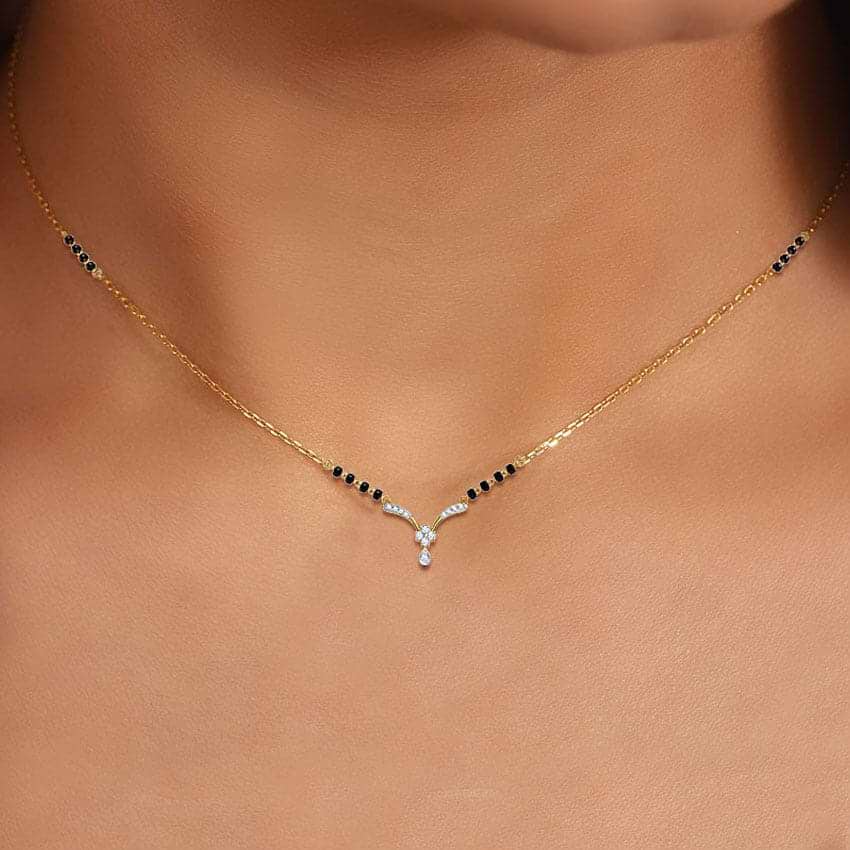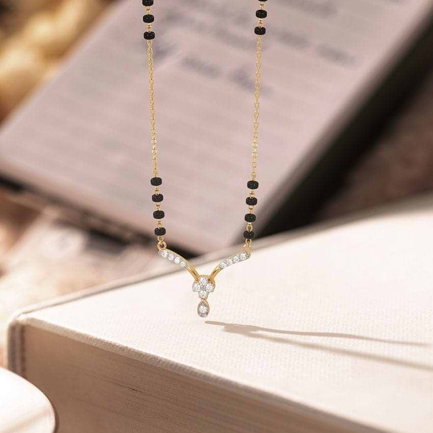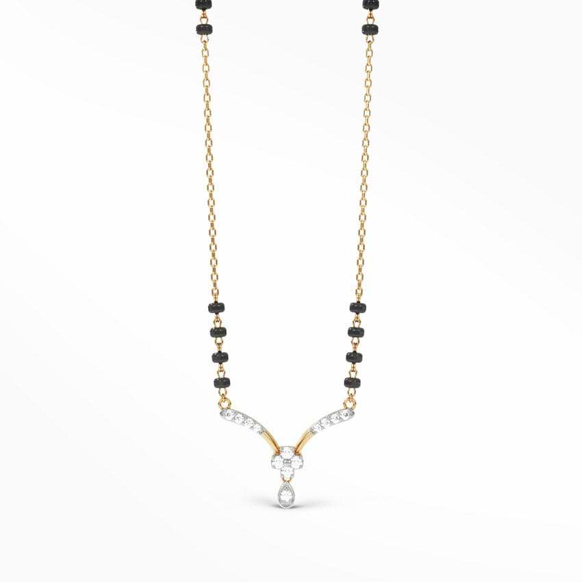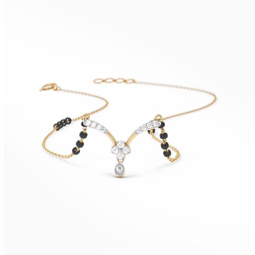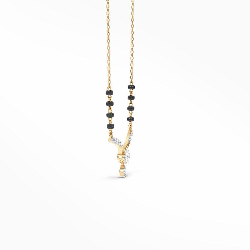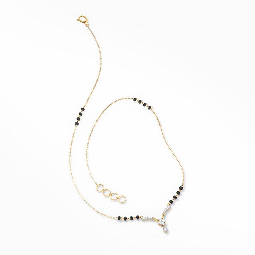 Zarah Diamond Mangalsutra by CaratLane. If you are a bride to be and looking for something unique and trendy, go with this dainty mangalsutra, a perfect blend of traditional and modern culture. An elegant mangalsutra available in 14 karat yellow gold (1.740 g) and IJ-SI diamond weighing 0.104 ct. The delicate and simple mangalsutra is a great daily-wear piece. Our mangalsutra design options are just endless! So, pick the one that resonates with your style and personality.